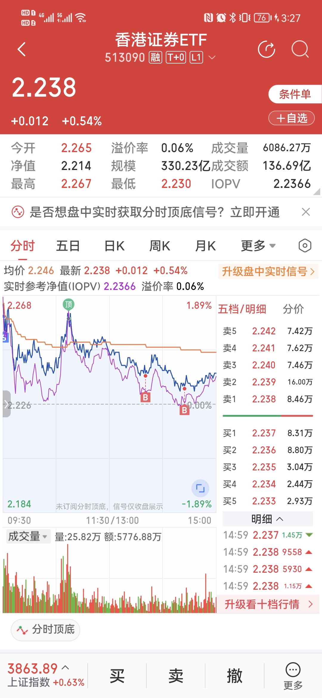 $香港证券ETF(SH513090)$ 开盘卖了,3.240、3.233回补完毕。