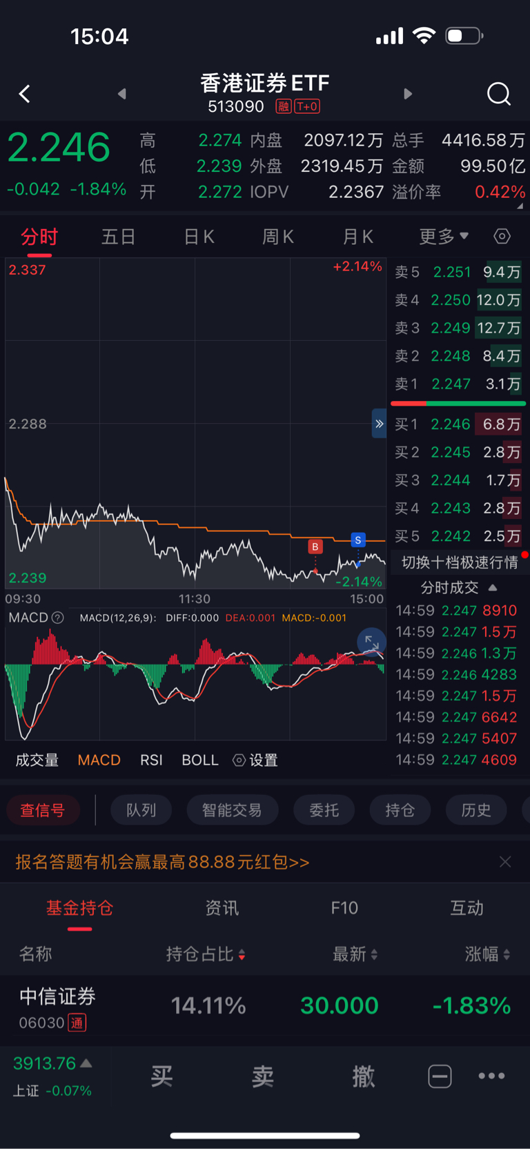 $香港证券ETF(SH513090)$ 真的没东西买了,挣几百跑路
