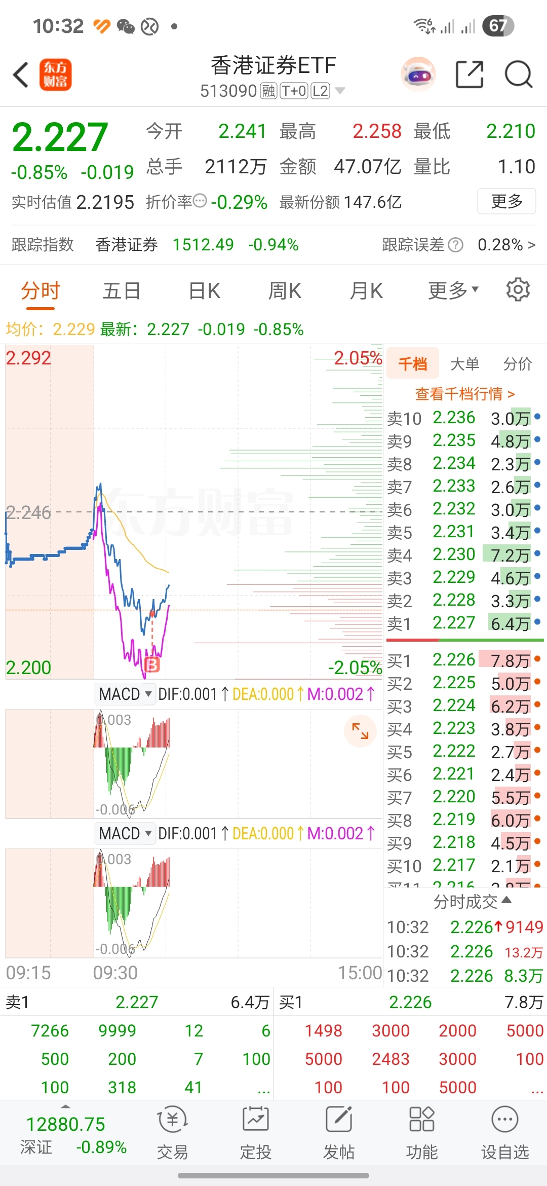 $香港证券ETF(SH513090)$ 银行大跌,证券就会拉伸,量能缩到极致,下午绝对会回暖