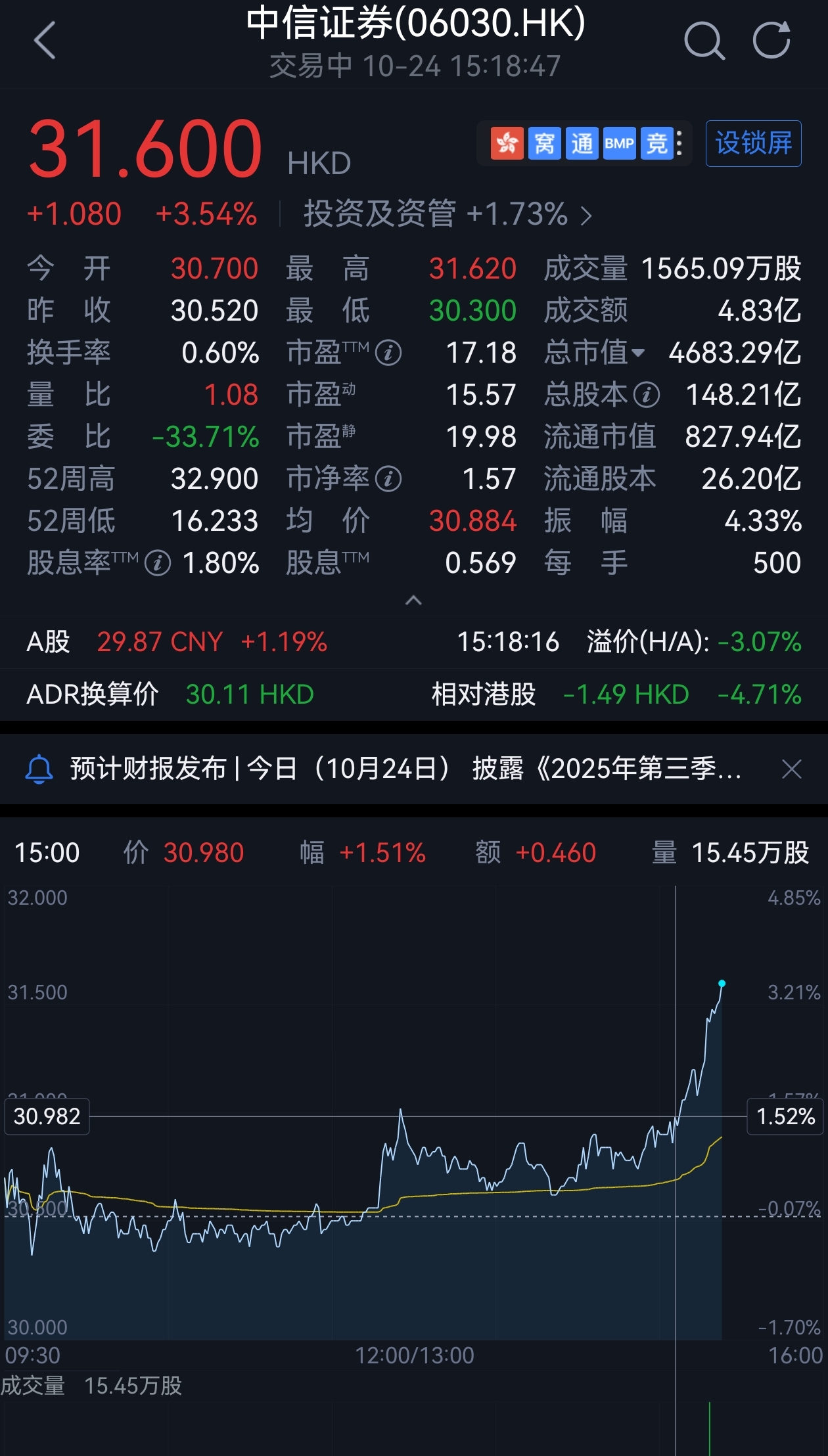 $香港证券ETF(SH513090)$ 这边收盘以后,中信大哥港股的走势,兄弟们,香港证券ETF现在还在替咱们赚钱,这你受得了吗?$中信证券(SH600030)$ $广发证券(SZ000776)$