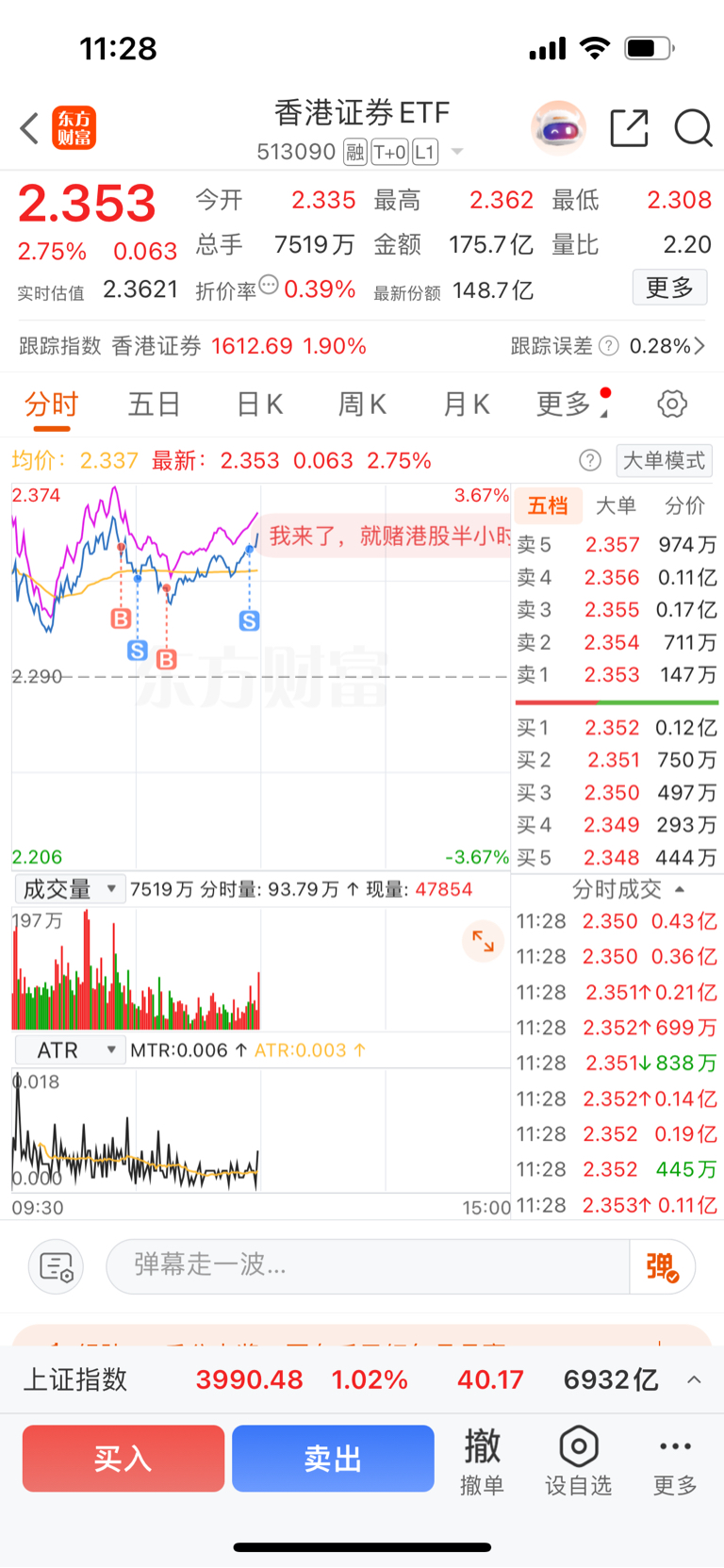 $香港证券ETF(SH513090)$ 这操盘手是看着我来的吗