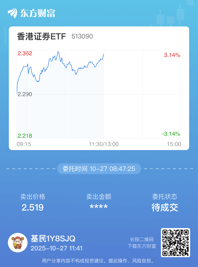 $香港证券ETF(SH513090)$ 涨停卖出