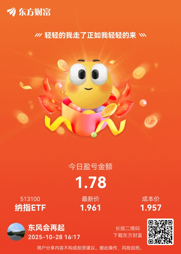 $纳指ETF(SH513100)$ 定投第1天,今日买入纳指ETF400股,今日盈亏1.78元,累计盈亏1.78元,静待花开~(实盘,原创,无小号)
