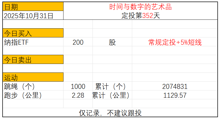 运动与投资第352天2025年10月31日今日定投:纳指ETF买入200股跳绳: