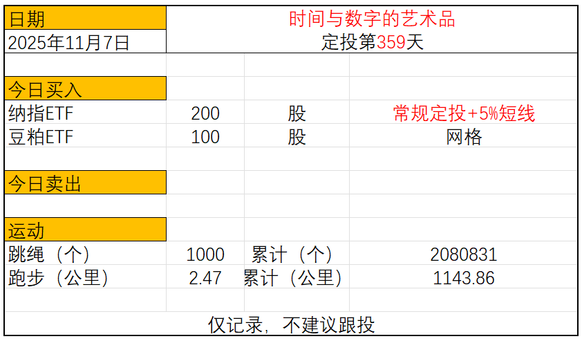 运动与投资第359天2025年11月7日今日定投:纳指ETF买入200股豆粕ET