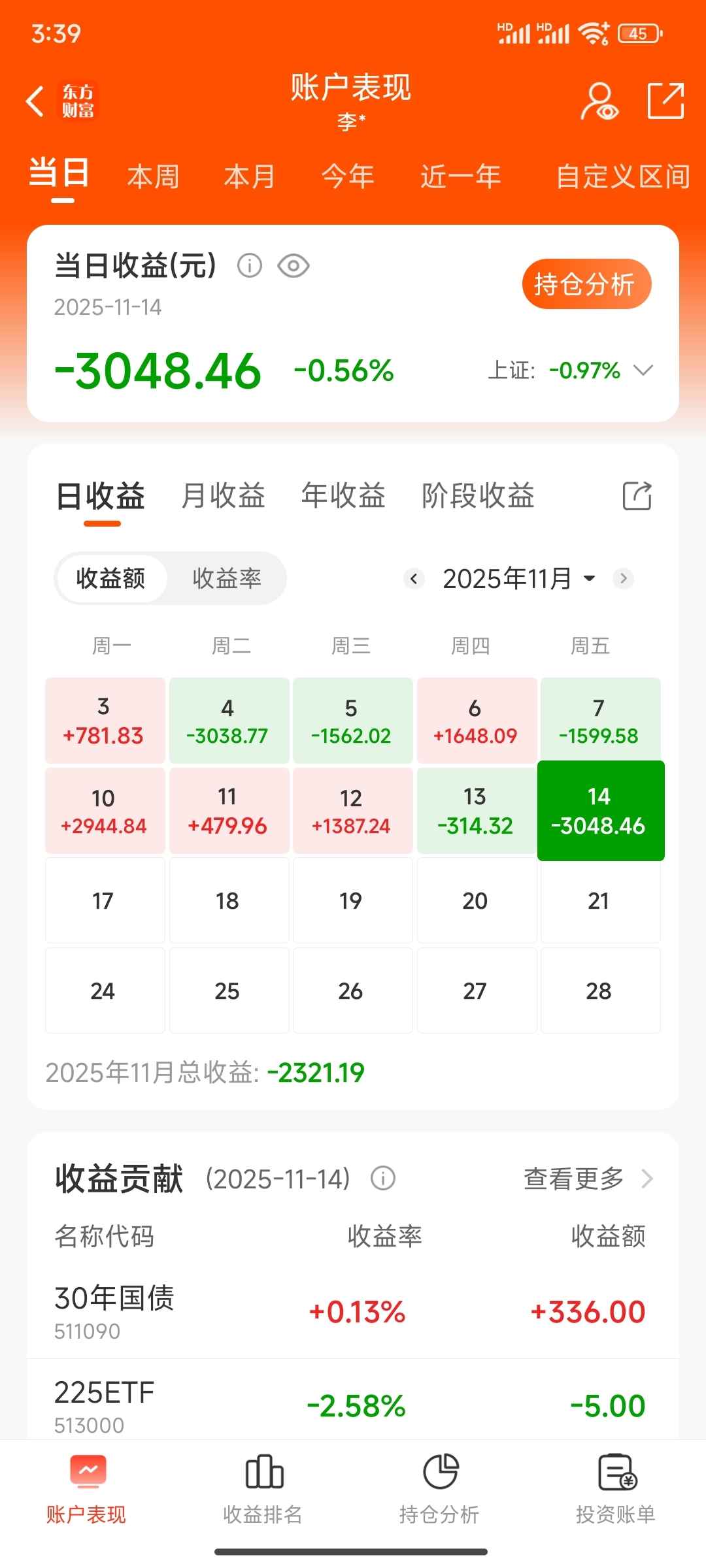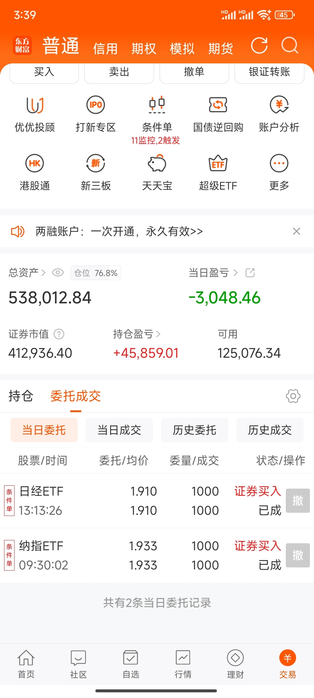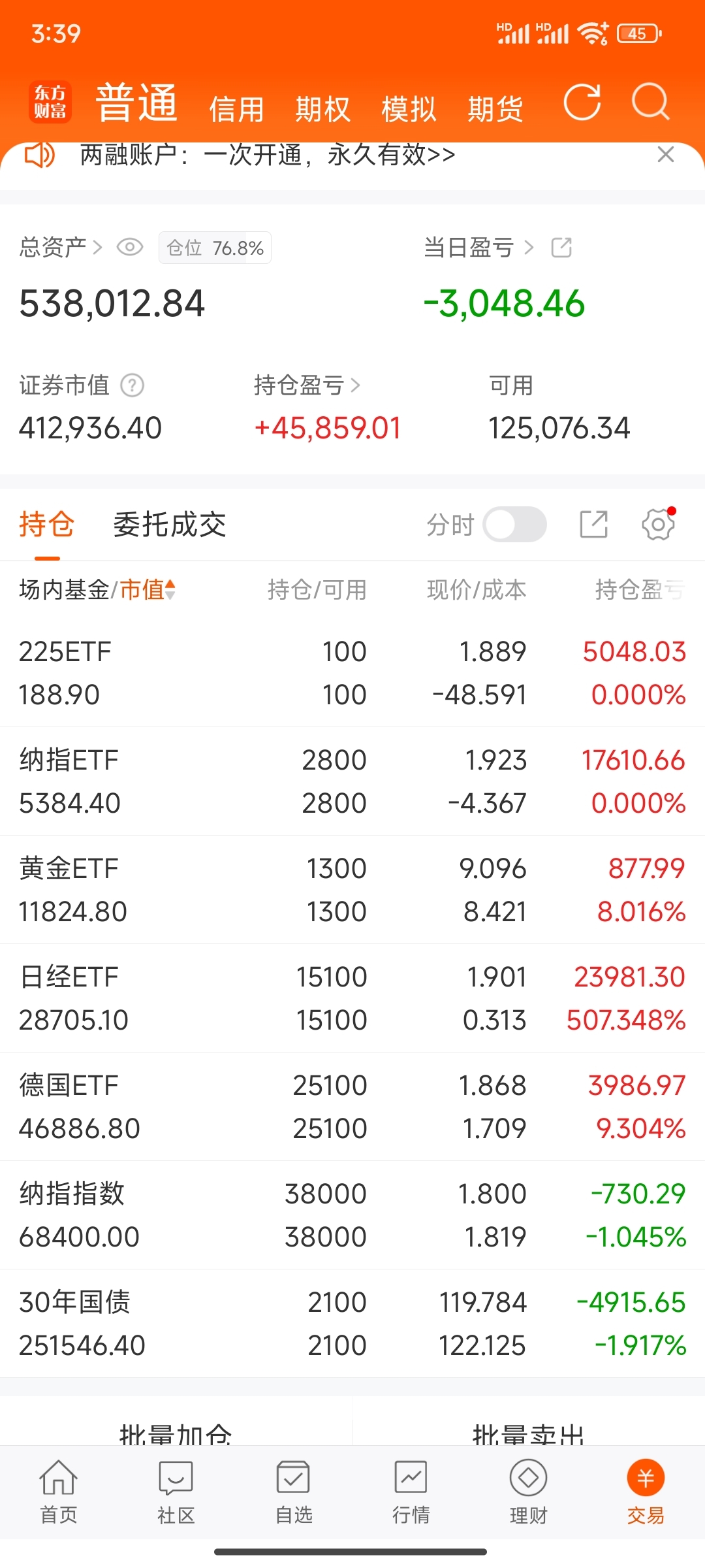 定投第210天,买入纳指日经各1000股,今日盈亏-3048,总盈亏+45859