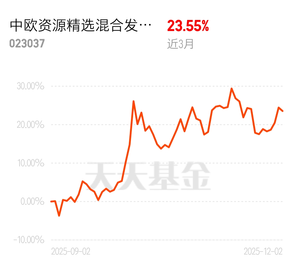 近期有色金属板块分化挺明显,普跌时有的基金扛不住,大涨时又跟不上。中欧资源精选混合发起 C 近 3 个月 23.55%,经理主动管理能力强,涨多跌少抗跌性好,在主动型基金里表现拔尖,赶紧布局。 $中欧资源精选混合发起C$