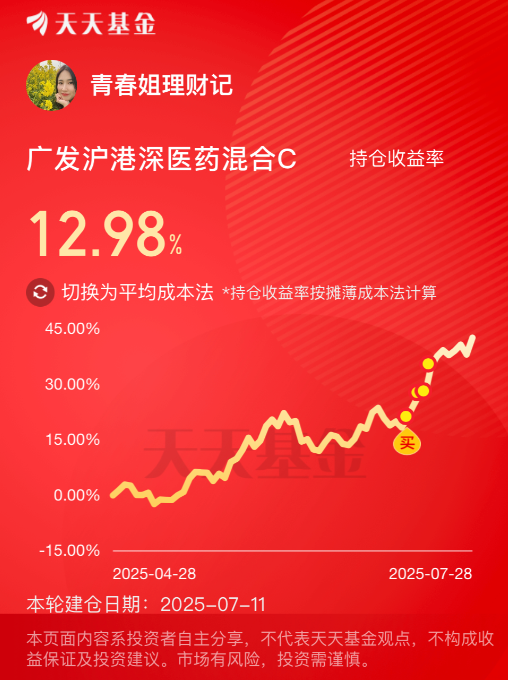 我继续加仓$广发沪港深医药混合C(OTCFUND|014115)$1000元,创新药继续涨涨涨!这只昨天刚大涨3.3%,今天盘中净值估算又涨3.47%左右,无疑是今年以来最能涨的板块,期间几次调整都能快速收复、并续创新高,业绩很能打!