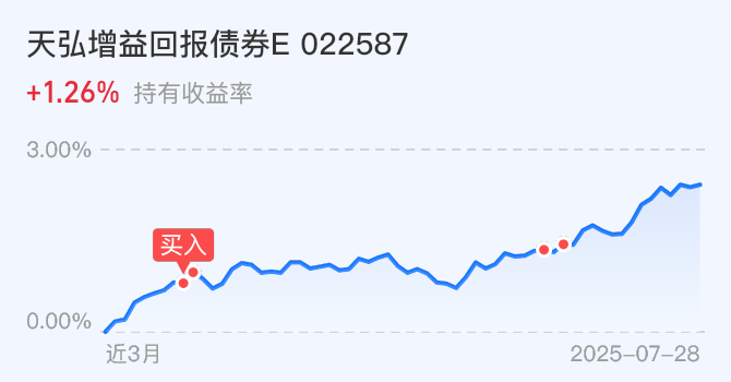 我加仓$天弘增益回报债券发起式E(OTCFUND|022587)$2688元,最近权益市场好起来,稳健资产配置中的纯债基不如混债固收+表现好了,增益昨天又收了4个大蛋,历史净值屡创历史新高!E类是后上的7天免赎份额,参考A类业绩2024年涨了9.57%、近1年涨了5.67%,成立以来稳中有进的涨了58.39%,是个不错的资产压舱石。