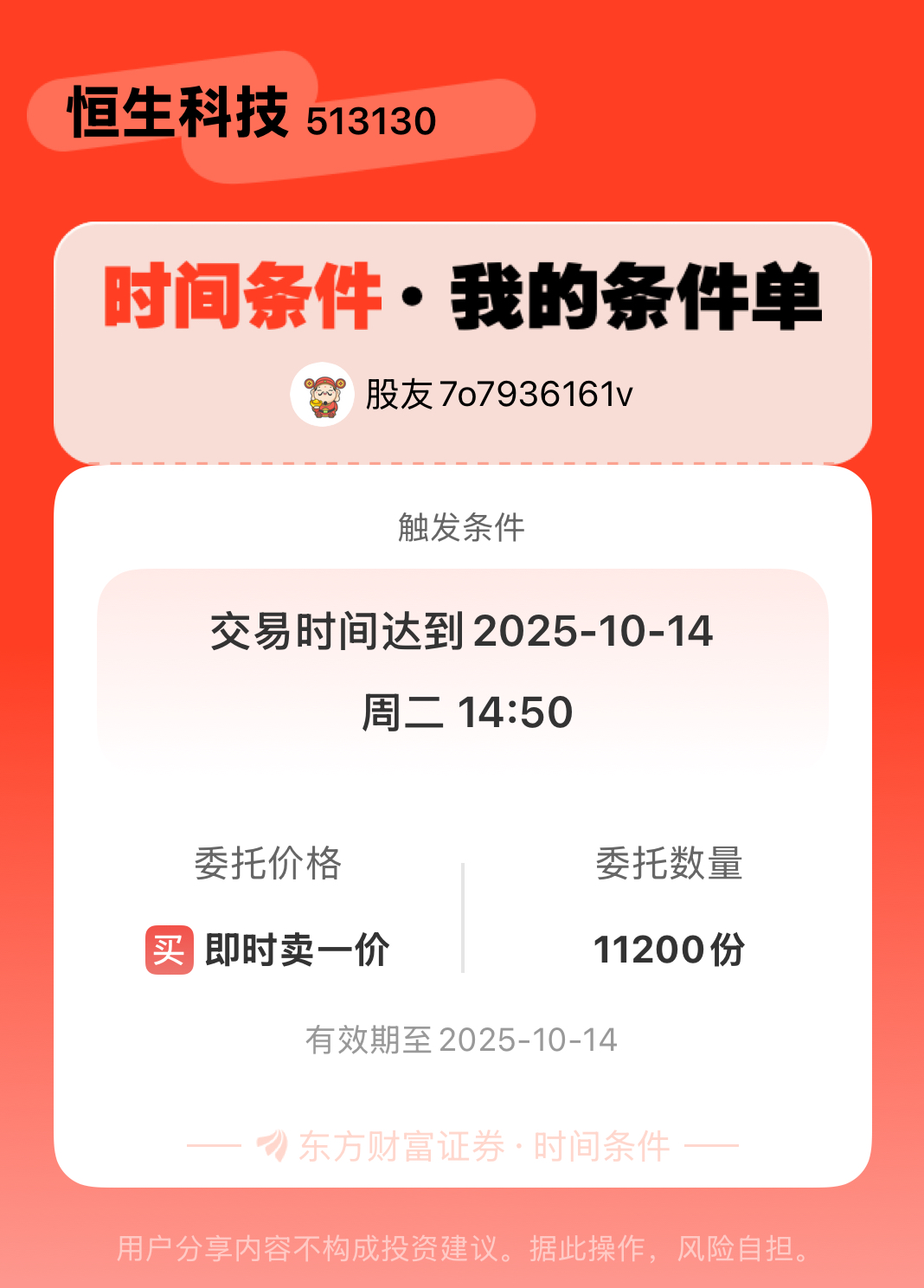 #条件单交流# #时间条件晒单# 一位股神设置了一个时间条件条件单,接下来就是见证奇迹的时刻~$恒生科技(SH513130)$