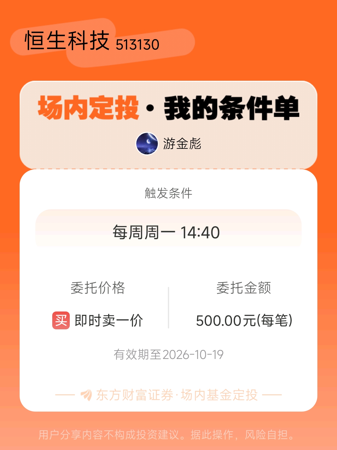 #条件单交流# #场内定投晒单# 一位股神设置了一个场内基金定投条件单,接下来就是见证奇迹的时刻~$恒生科技(SH513130)$