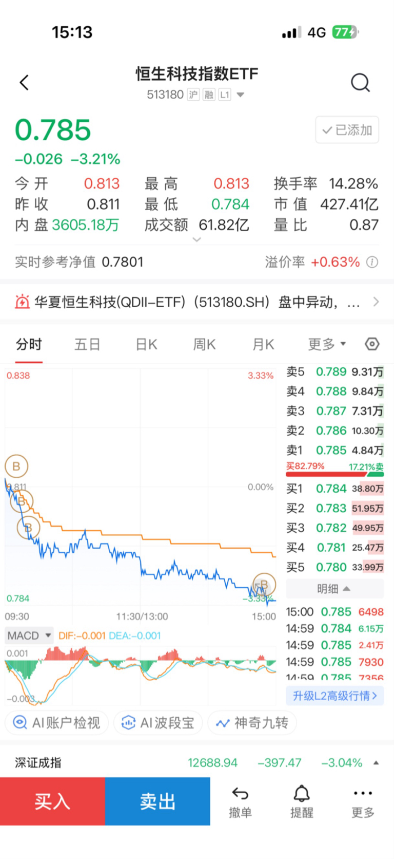 $恒生科技指数ETF(SH513180)$ 买崩了,后面一小时还在跌