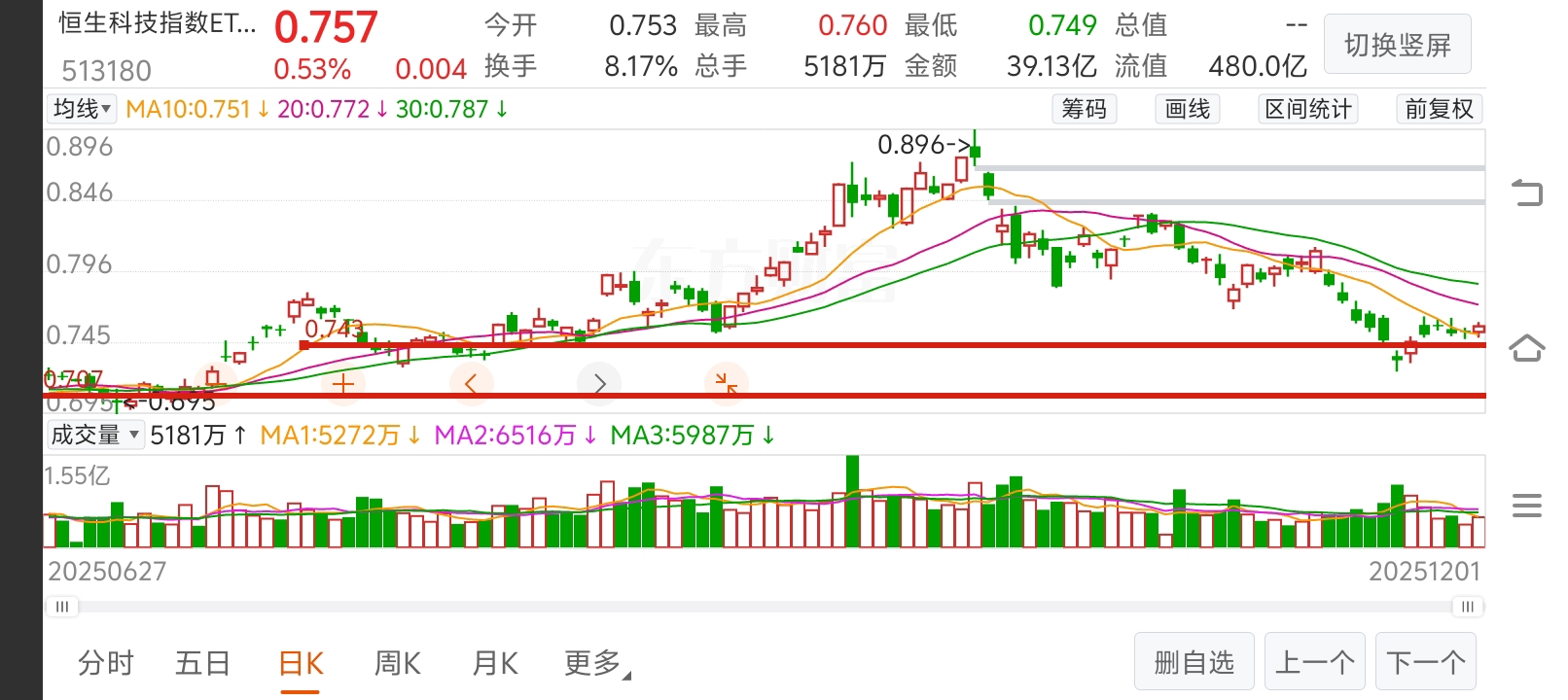 $恒生科技指数ETF(SH513180)$ 买点和今天明天不同的,下方两个支撑位,分两批进入,回踩即是买点。仓位总计分配20%。