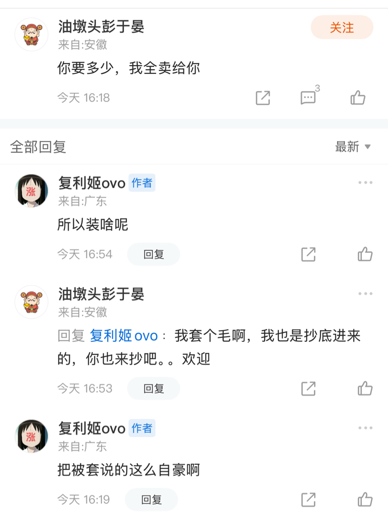温馨提示: 1.根据《证券法》规定,禁止编造、传播虚假信息或者误导性信息,扰乱证券市场;2.用户在本社区发表的所有资料、言论等仅代表个人观点,与本网站立场无关,不对您构成任何投资建议。用户应基于自己的独立判断,自行决定证券投资并承担相应风险。《东方财富社区管理规定》
