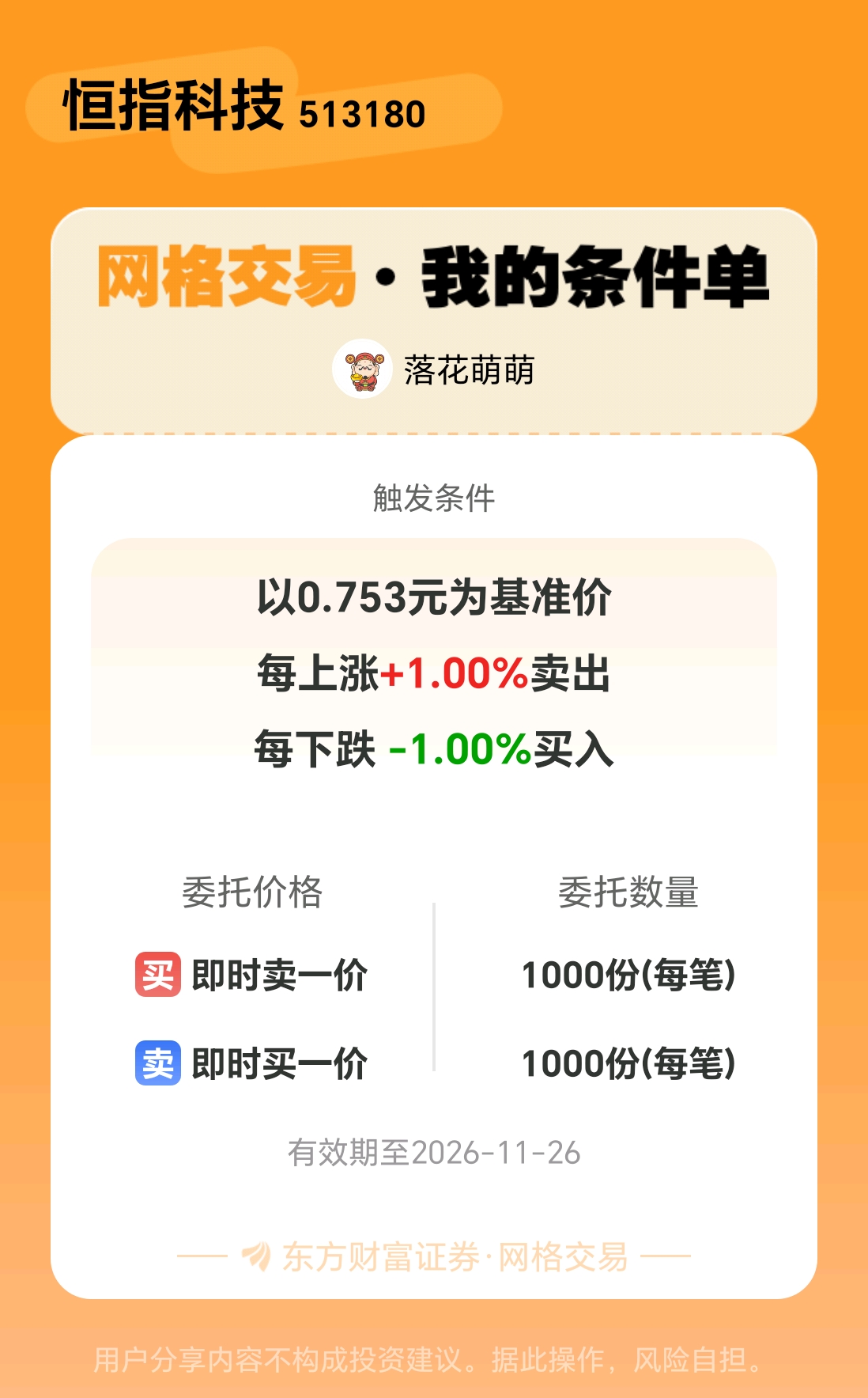 #条件单交流# #网格交易晒单# 一位股神设置了一个网格交易条件单,接下来就是见证奇迹的时刻~$恒指科技(SH513180)$