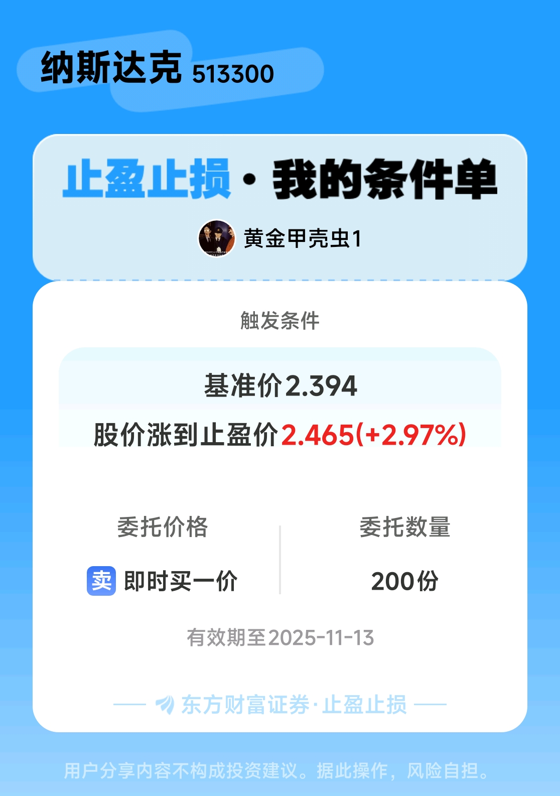#条件单交流# #止盈止损晒单# 一位股神设置了一个止盈止损条件单,接下来就是见证奇迹的时刻~$纳斯达克(SH513300)$