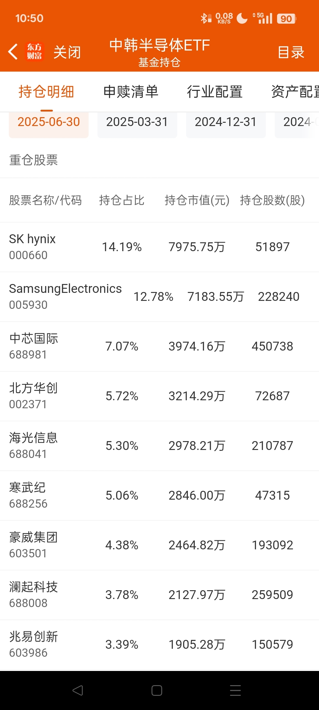 $中韩半导体ETF(SH513310)$ 这个基金持仓股重仓韩国三星海力士中芯国际占只有0.7