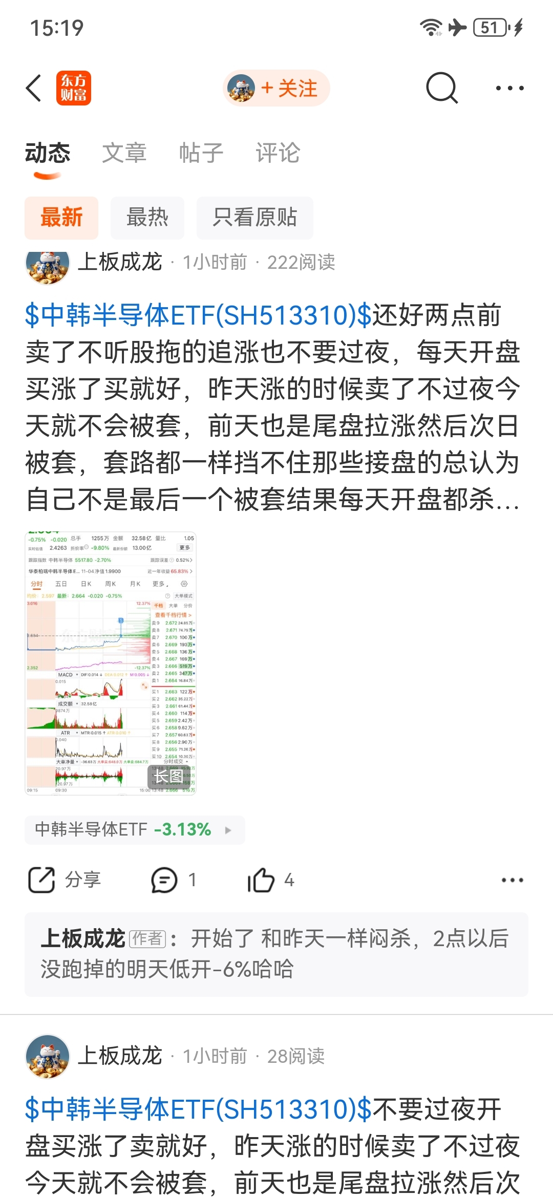 $中韩半导体ETF(SH513310)$ 什么时候才能清静点,少些卖完就幸灾乐祸的撒皮,完全是污染环境,出来装股神,真那么牛逼还用圈粉