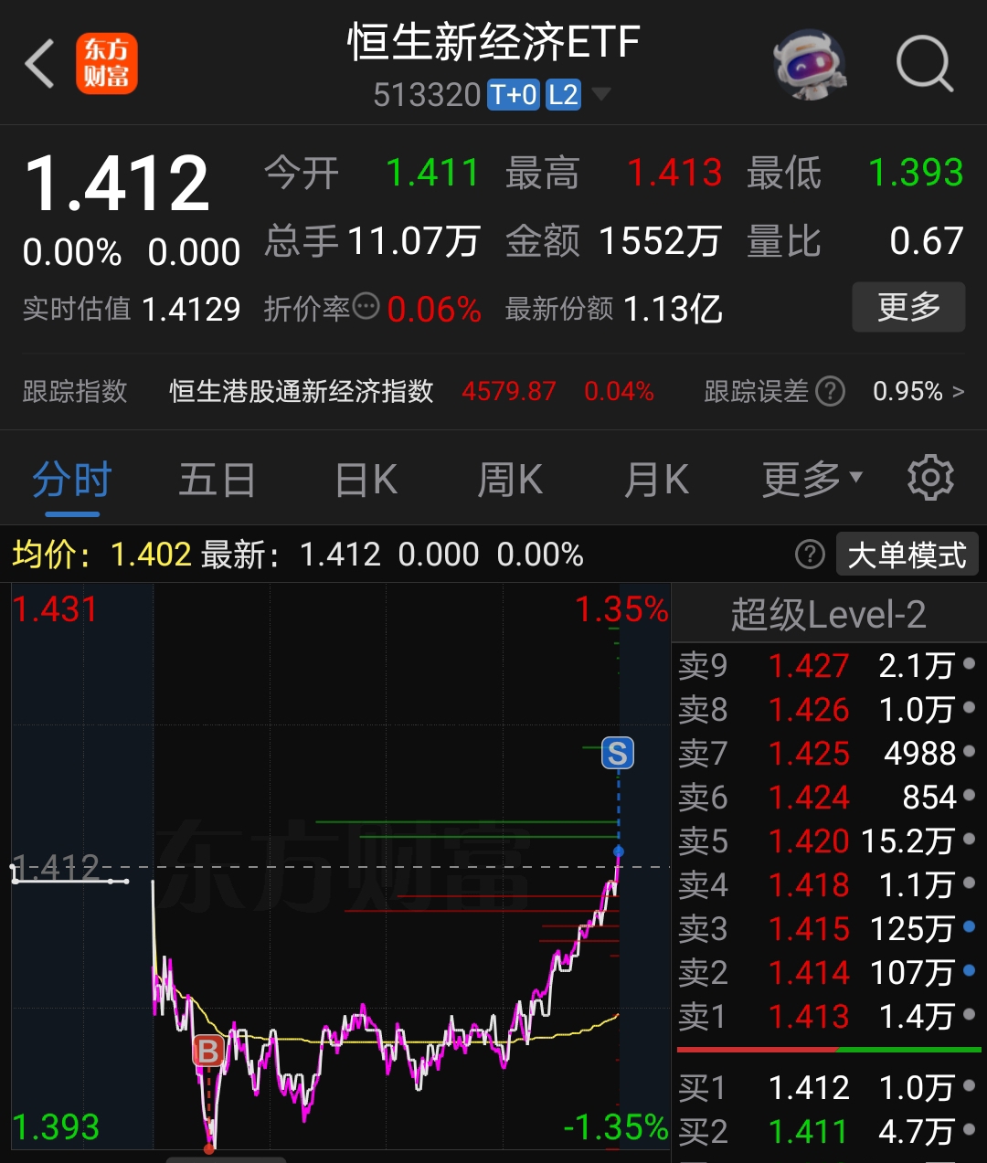 拿了一天,挣了1.4个点。最开心的是出在了1.413,今日最高点。就只做了两万股