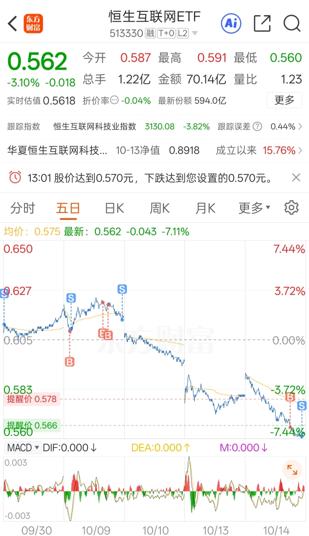 $恒生互联网ETF(SH513330)$ 虽然我上午看完盘之后预判下午会炸一下,但是我真没想到0.565买进去的,0.566都没跑掉,跟上次一样血亏呀。