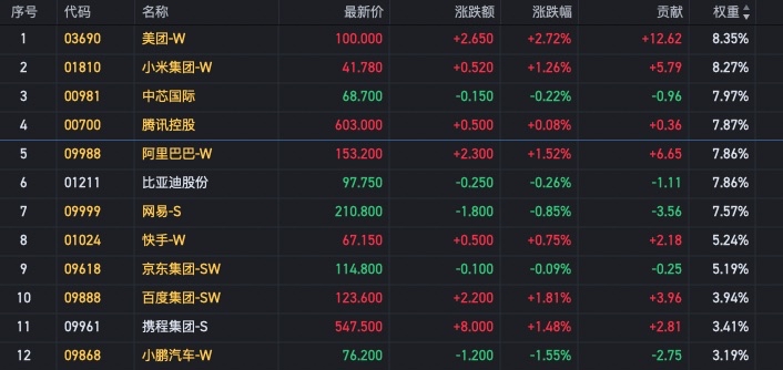 $恒生互联网ETF(SH513330)$ 800700 恒生科技原始指数的持仓看下,头牌小米和美团