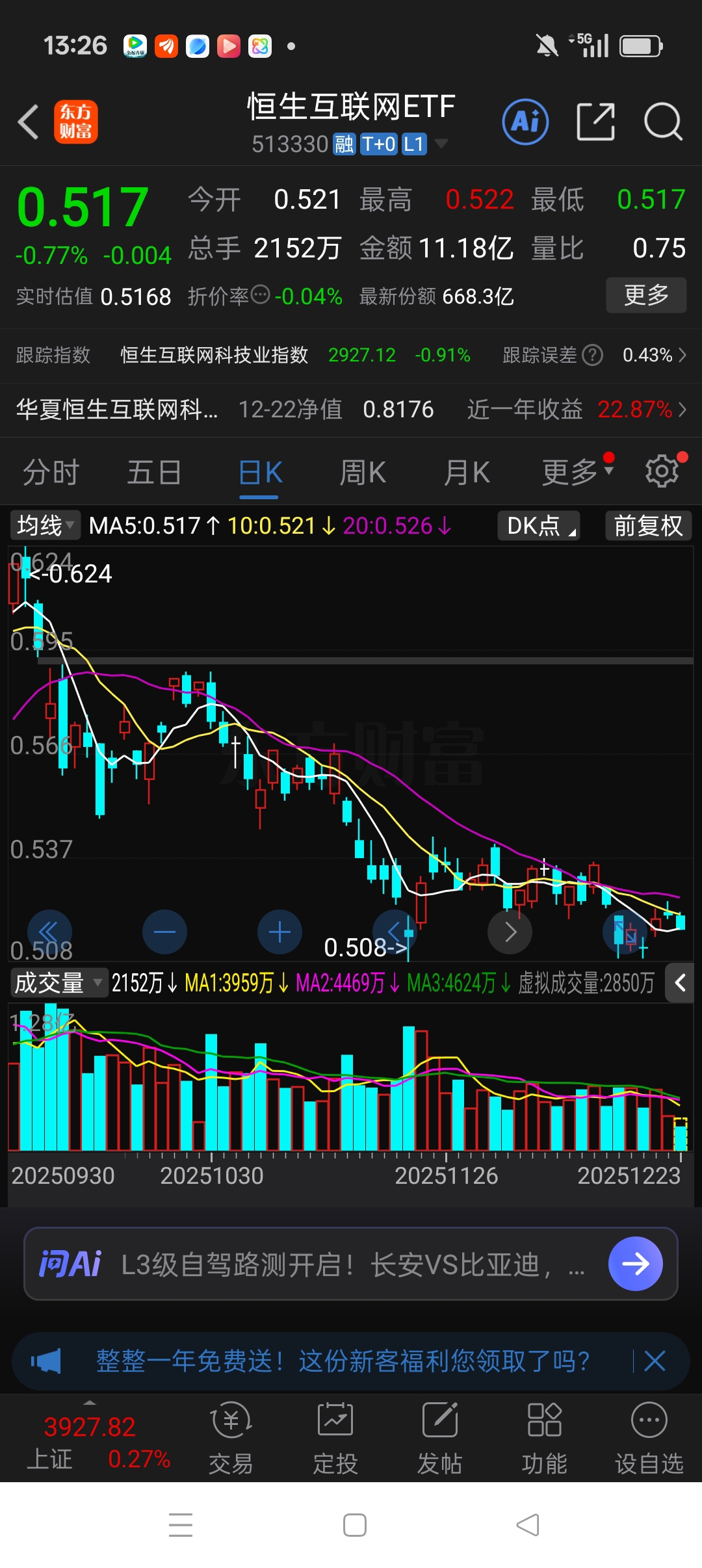 $恒生互联网ETF(SH513330)$ 整整跌3个月了,它再跌3个月会反弹吗?