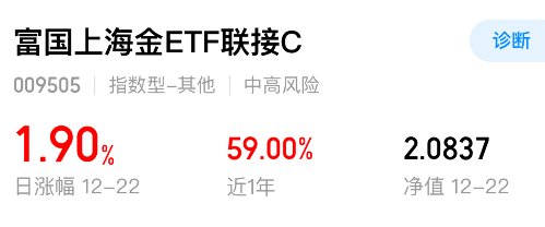 隔夜国际金价突破4400美元/盎司、今天国内金价突破1000元,均创下历史新高点!外资机构2026年看好黄金能涨到5000美元,如果真能涨到就还有14%左右的上涨空间,关键压力位得到突破,叠加年末敏感时间,配置黄金没啥问题,可以考虑布局$富国上海金ETF联接C(OTCFUND|009505)$,紧跟国际金价,年内已涨超58%!
