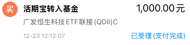 我加仓$广发恒生科技ETF联接(QDII)C(OTCFUND|012805)$1000元,跟踪的恒生科技指数这会看跌0.5%左右,年线强支撑已经失而复得,连续4天阳线后有个小震荡正常,正好我仓位不多,今天继续低吸一笔。