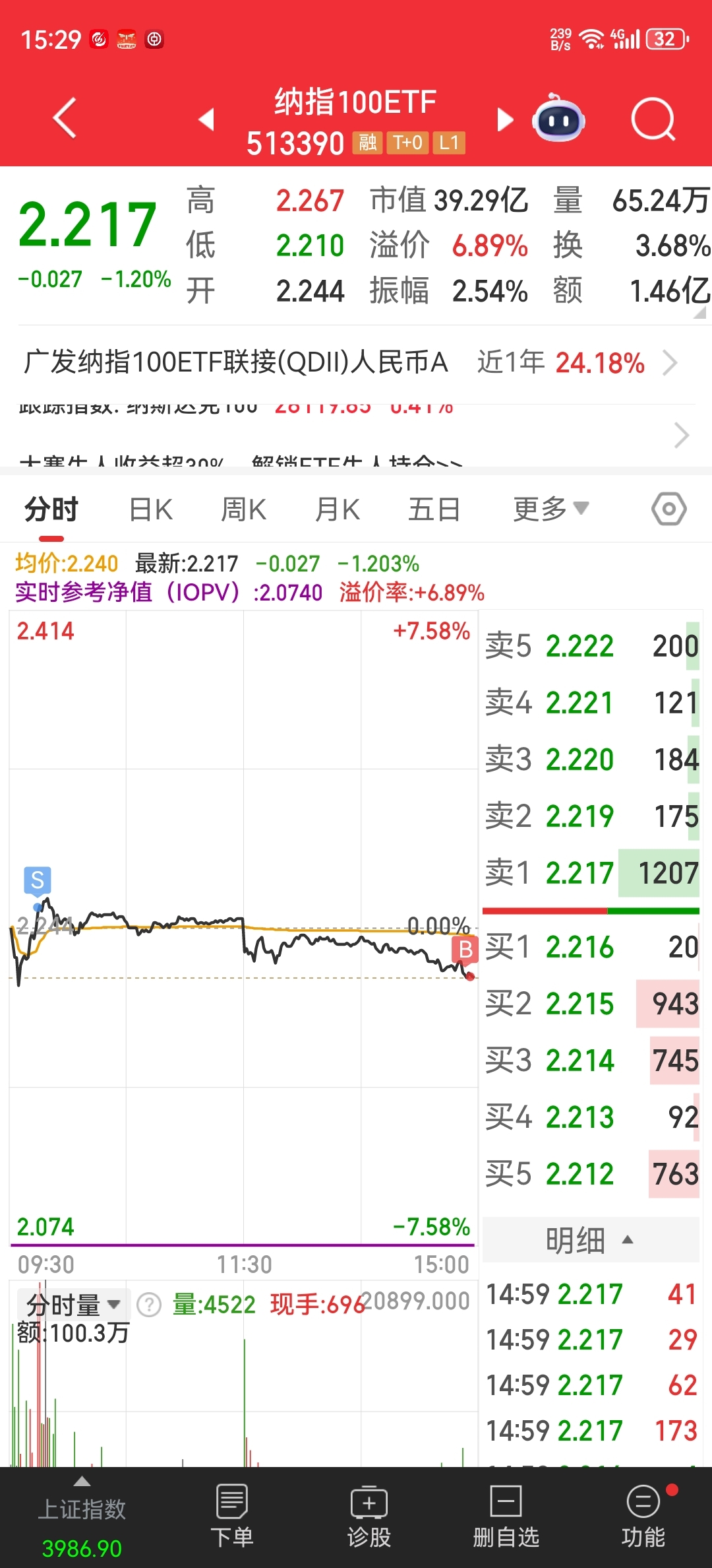 $纳指100ETF(SH513390)$ 今天早盘冲高全仓出尽,尾盘接回1.5成仓。若明天低开再接回3.5成仓,高开则清仓!