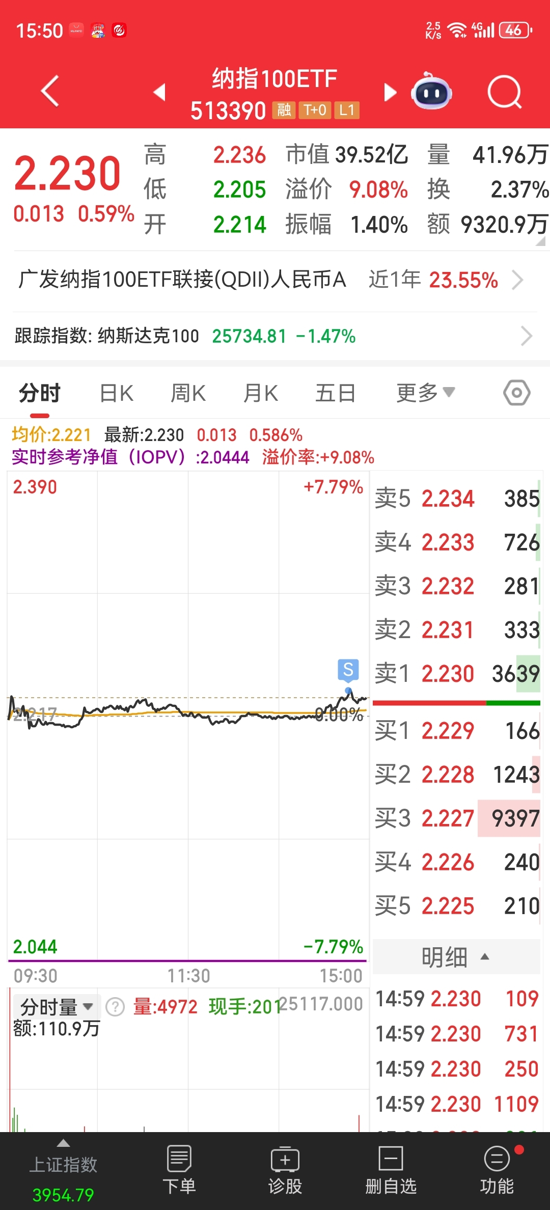 $纳指100ETF(SH513390)$ 尾盘将昨日尾盘接回的仓位以2.235清仓,其溢价率己超9%,技术形态显示需进行调整。将资金切换至近期风头渐劲的纳指生物科技ETF,其技术形态较好,溢价率适中,易于长期持有。