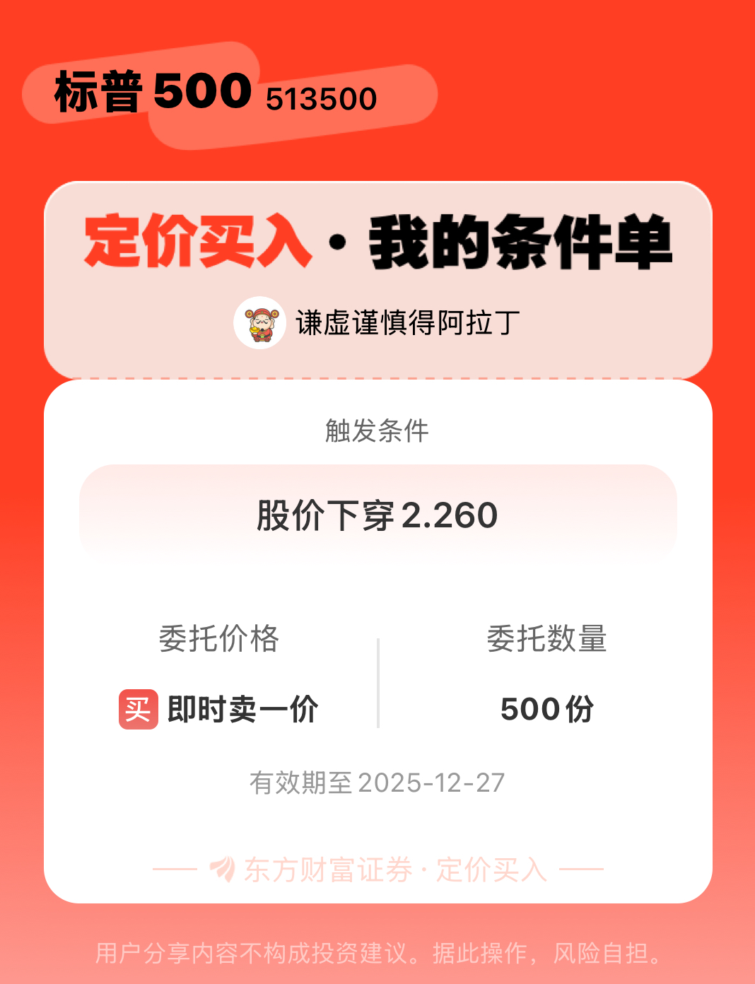 #条件单交流# #定价买入晒单# 一位股神设置了一个定价买入条件单,接下来就是见证奇迹的时刻~$标普500(SH513500)$