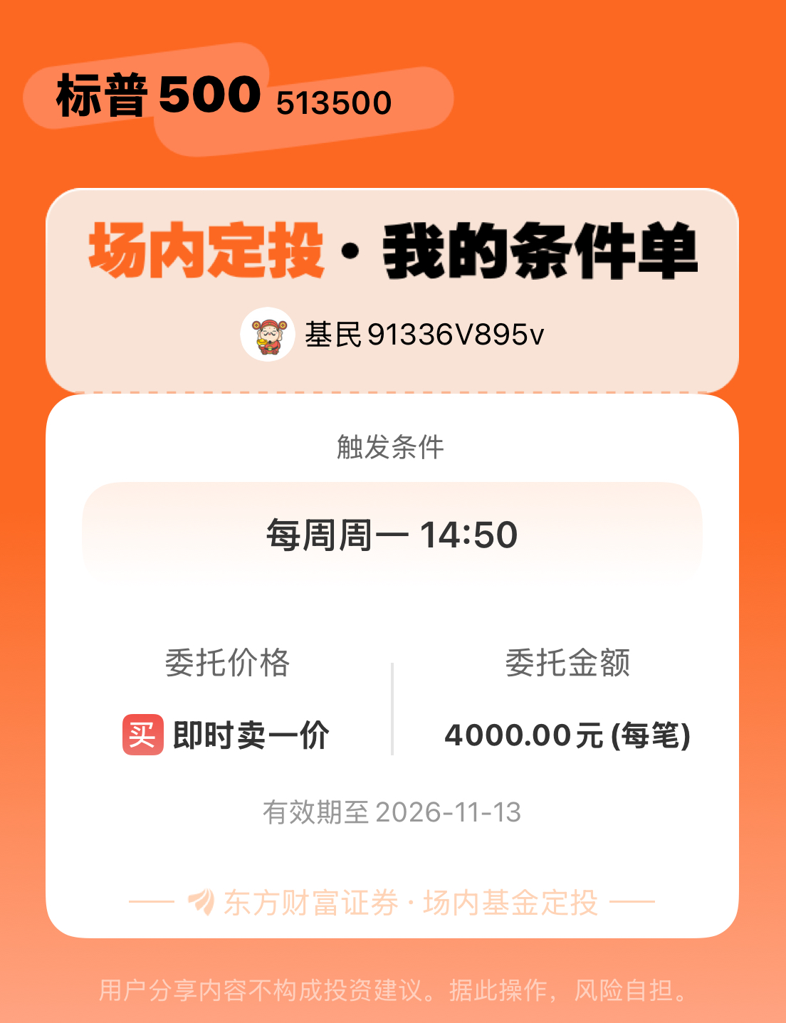 #条件单交流# #场内定投晒单# 一位股神设置了一个场内基金定投条件单,接下来就是见证奇迹的时刻~$标普500(SH513500)$