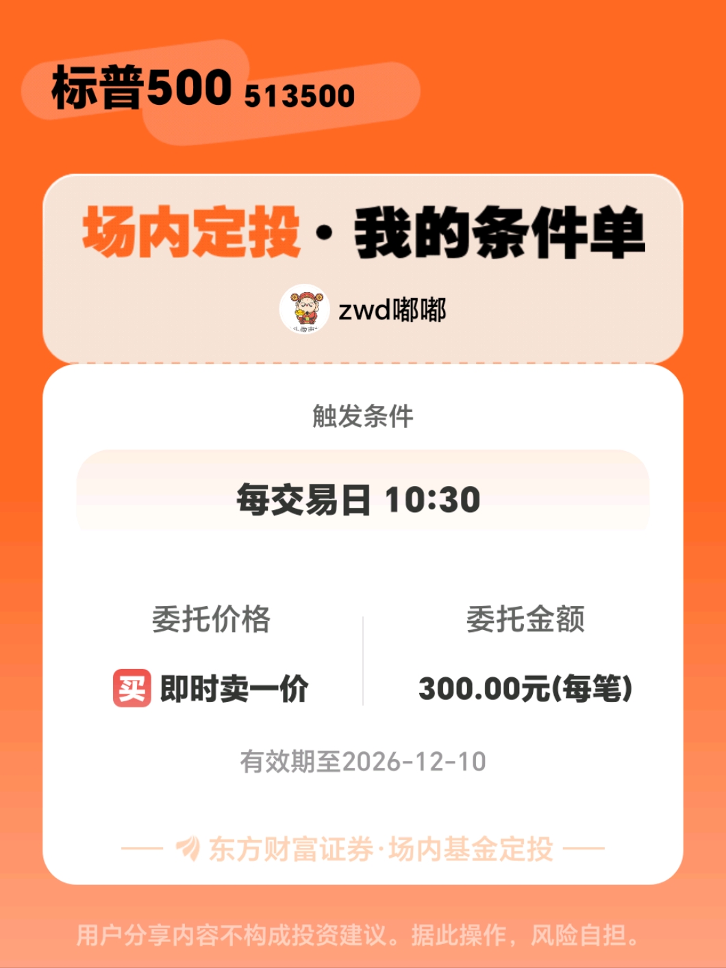 #条件单交流# #场内定投晒单# 一位股神设置了一个场内基金定投条件单,接下来就是见证奇迹的时刻~$标普500(SH513500)$