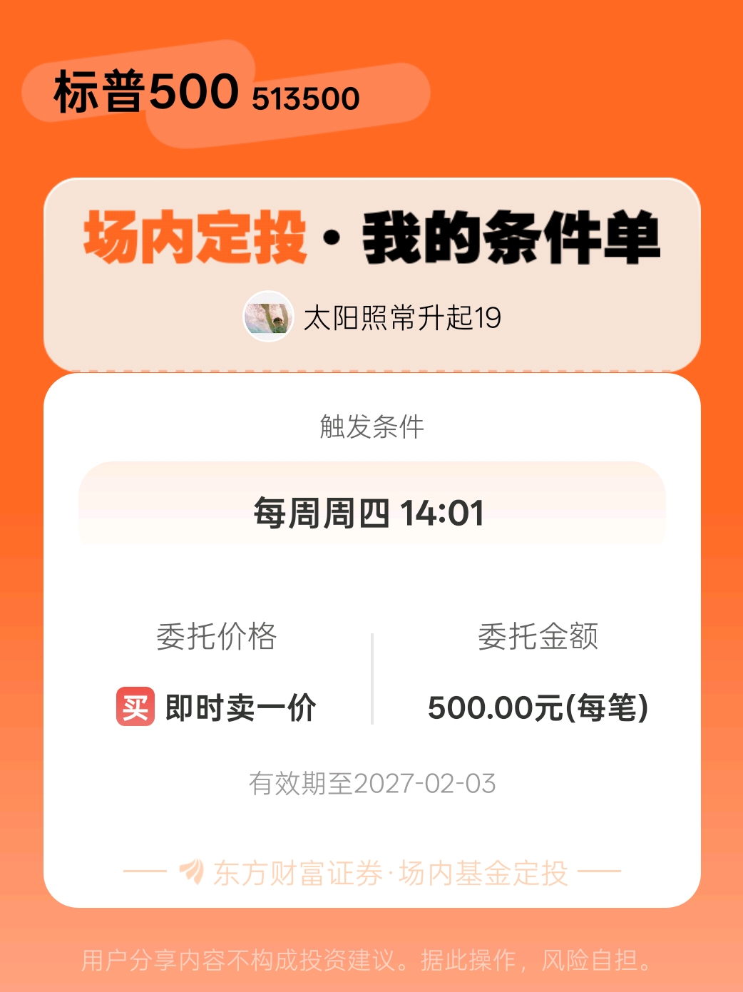 #条件单交流# #场内定投晒单# 一位股神设置了一个场内基金定投条件单,接下来就是见证奇迹的时刻~$标普500(SH513500)$
