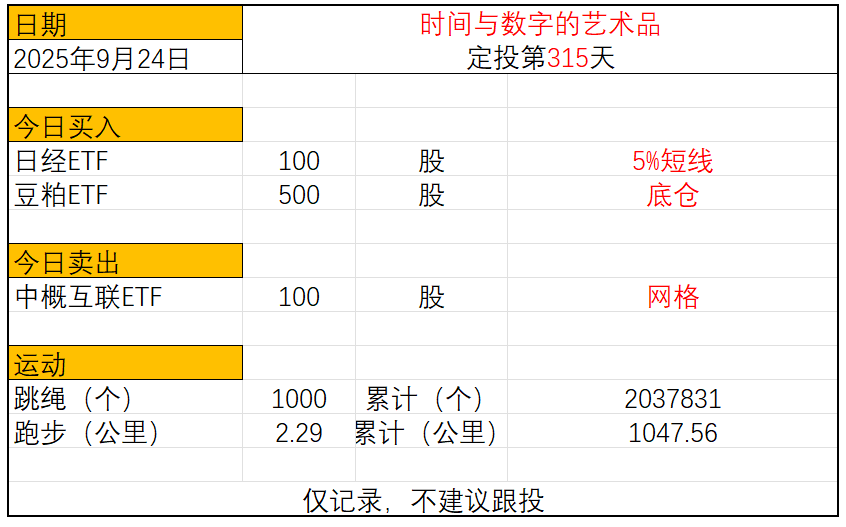 运动与投资第315天2025年9月24日今日定投:日经ETF买入100股豆粕ET