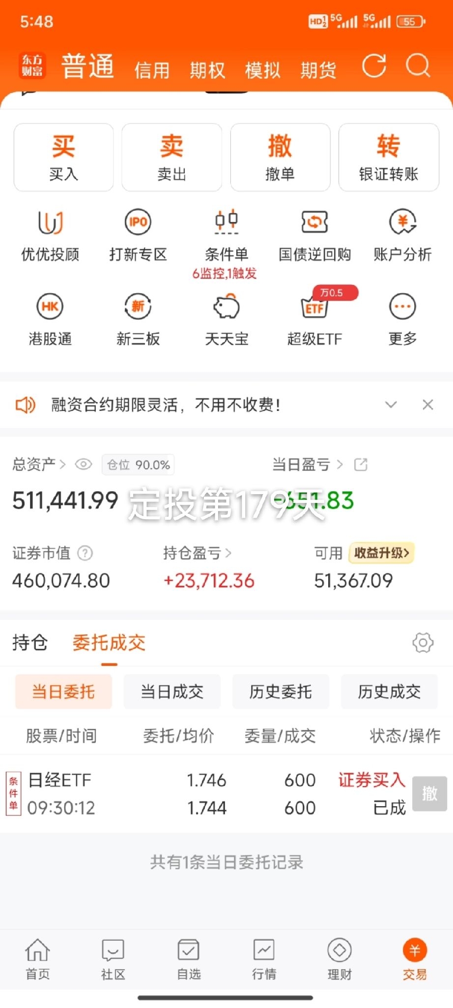定投第179天,买入日经600股,今日盈亏-651,总盈亏+23712。
