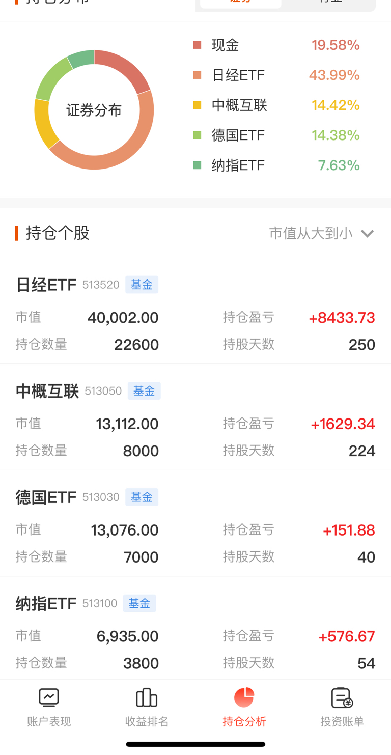 $日经ETF(SH513520)$ 定投第 38天,卖出中概互联ETF1200股,今日盈亏1723元,今年累计盈亏12558元,种一棵树最好的时间是十年前,其次是现在~(实盘,原创)只记录分享,不做推荐!盈亏自负!