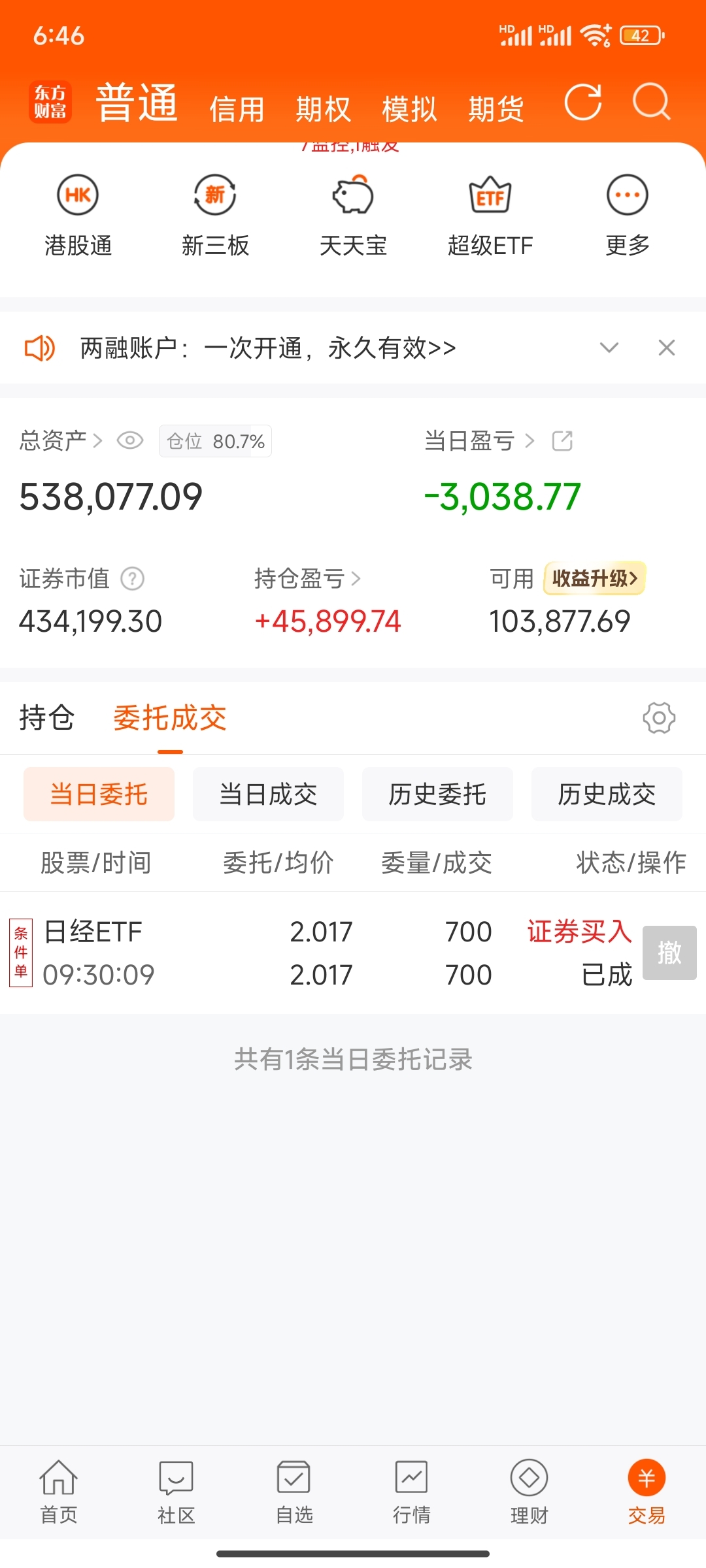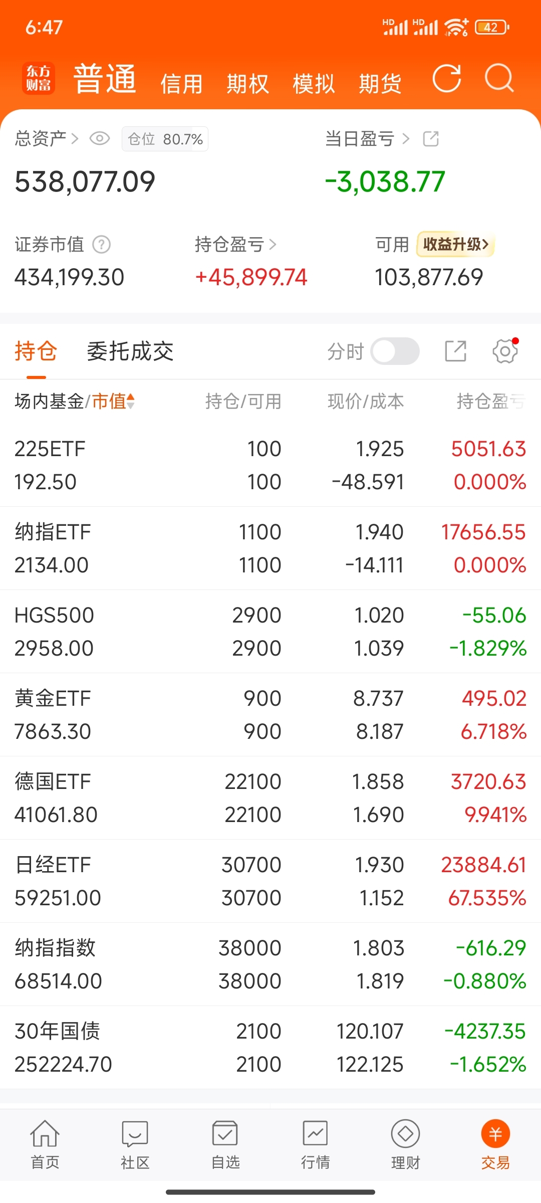 定投第200天,买入日经700股,今日盈亏-3038,总盈亏+45899。