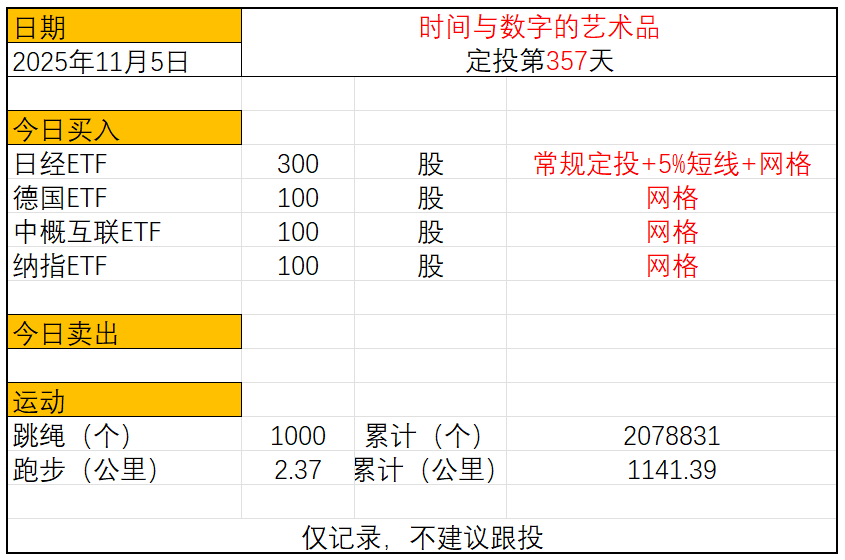 运动与投资第357天2025年11月5日今日定投:日经ETF买入300股纳指ET