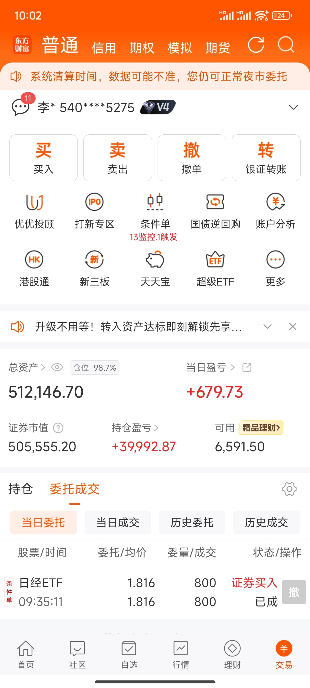 第221天,买入日经ETF,800股,今日盈亏+679,总盈亏+39992。..