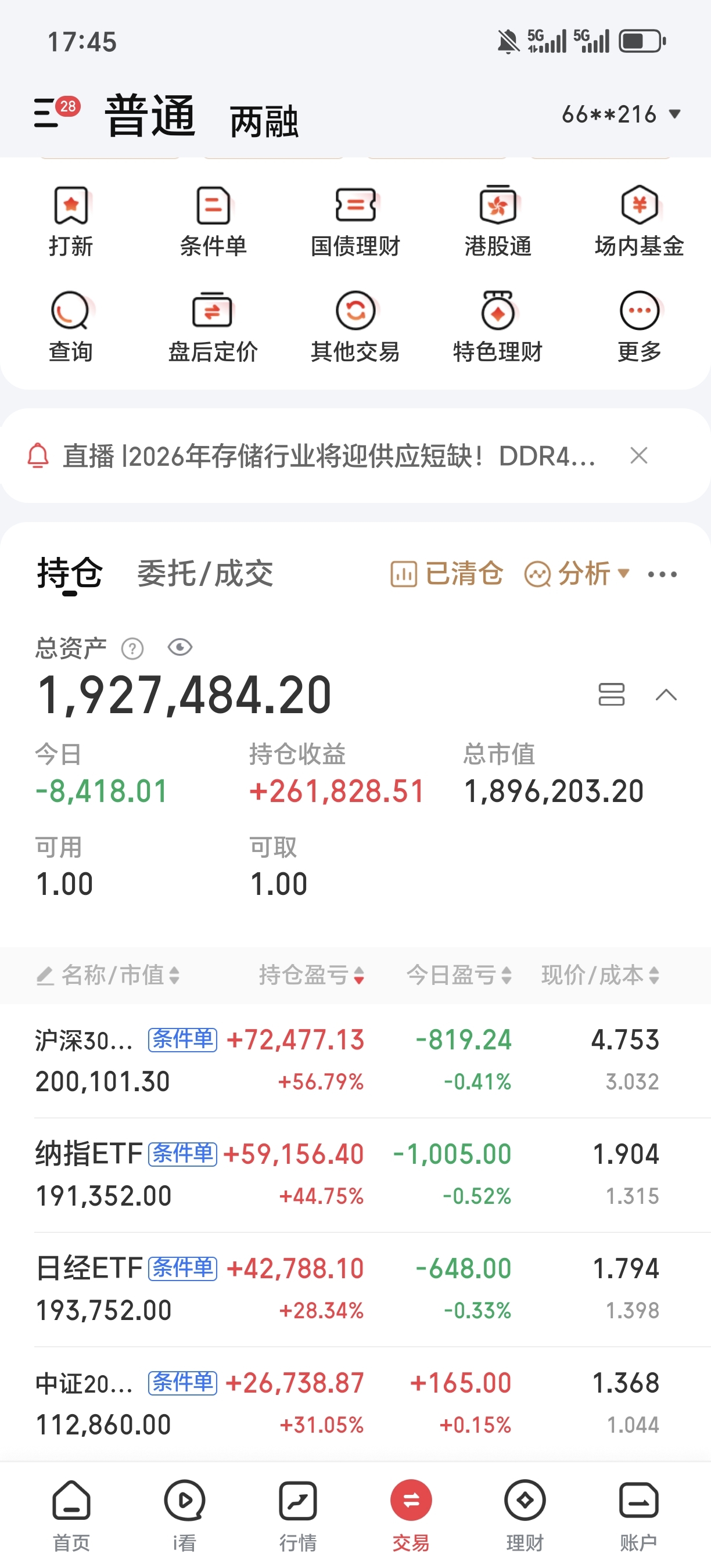定投网格两年整今日盈亏:-8418元今年收益:195036整体收益:278800