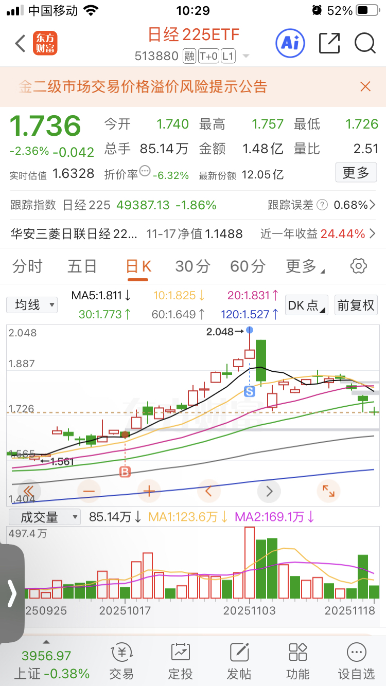 $日经225ETF(SH513880)$ 溢价-3以内,可以考虑从新杀回去了。嘿嘿