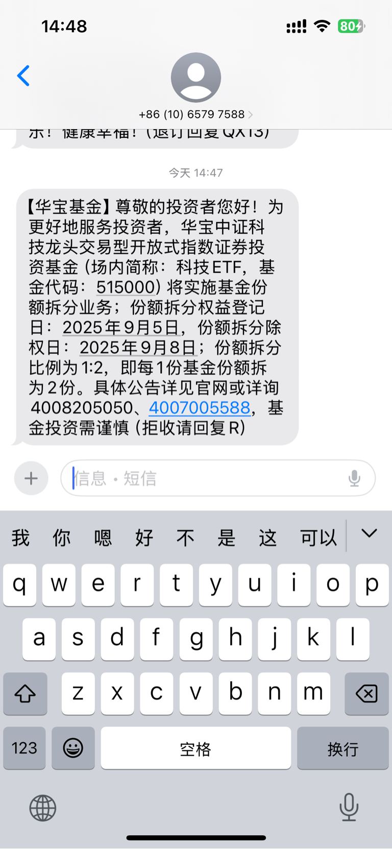 $科技ETF(SH515000)$ 给发短信了,基金拆分是利好还是利空?挺急的