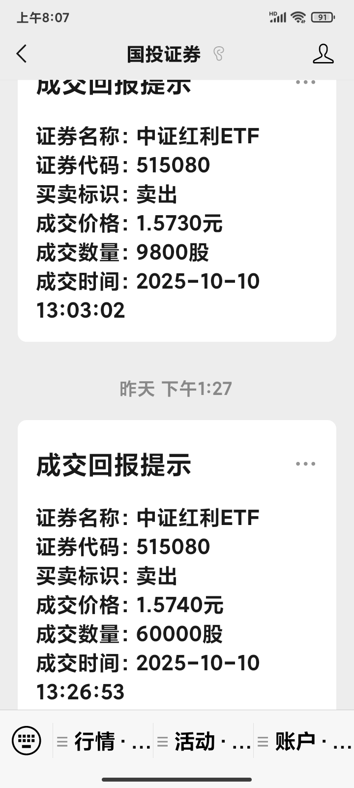 $中证红利ETF(SH515080)$ 买基金不要考虑分红,分红不一定是好事,【大机够套线】看净直最重要你感觉高了卖感觉底了买,分红前几天买的,昨天卖了,【赚钱了】