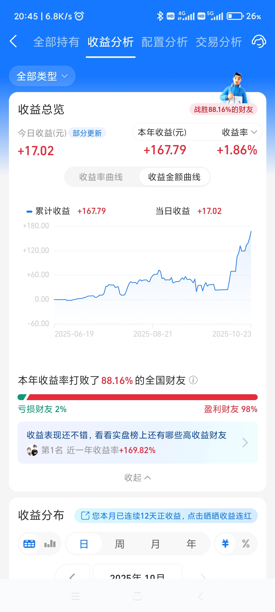 [251023]理财第60天,今天赚了+17.02元,累计盈利+167.79元。
