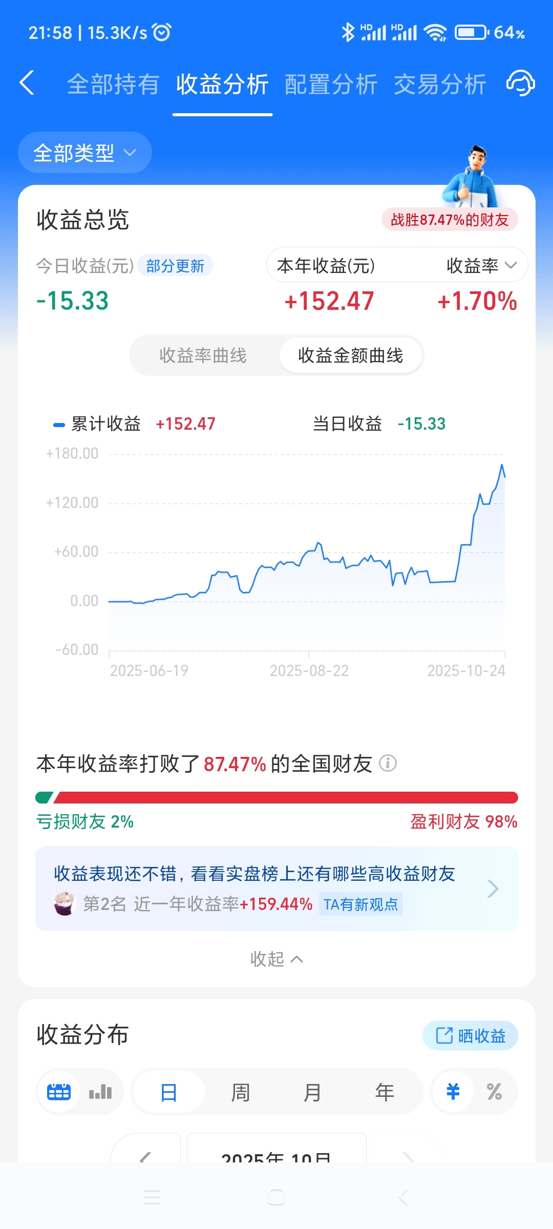 [251024]理财第61天,今天亏了-15.33元,累计盈利+152.47元。