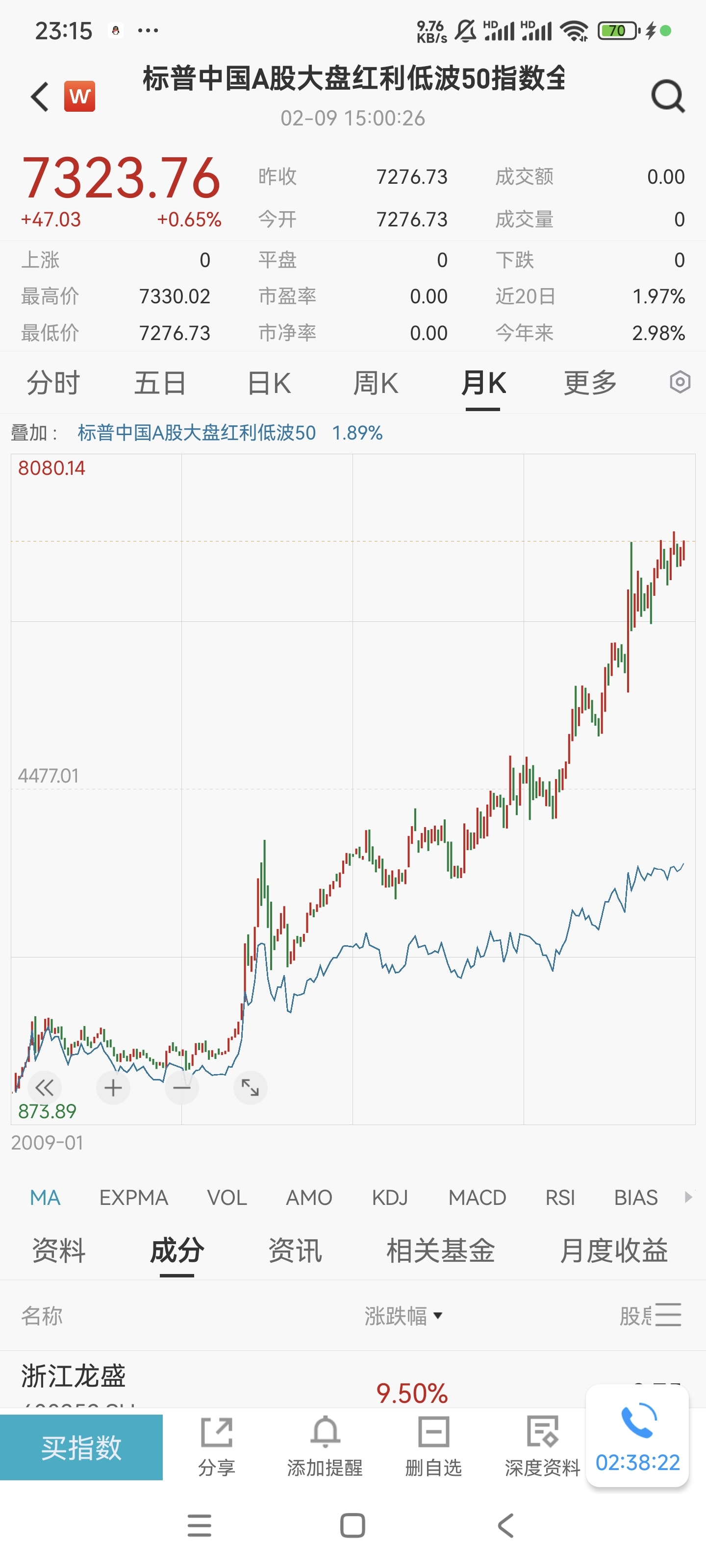 让股息更加具体化,蓝色的是低波50的价格走势,上面k线是对应的全收益,收益差就是股息率。我们买的场内外都是跟踪上面那条线的,真实收益还要扣掉基金的各种费用。
