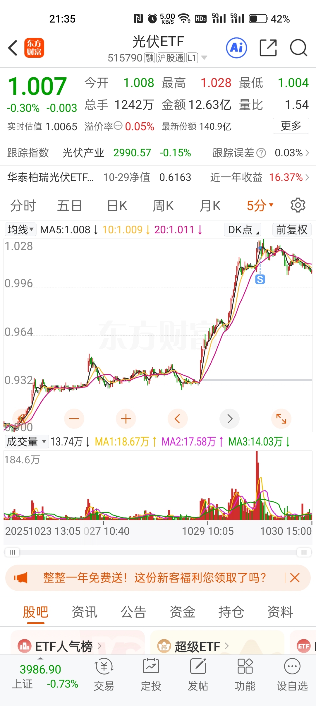 $光伏ETF(SH515790)$ $隆基绿能(SH601012)$ 清仓了,各位,我的隆基也在昨天卖差不多了。不是不相信光伏,我实在不相信这个大盘指数,涨了1000点不回调,我不信!