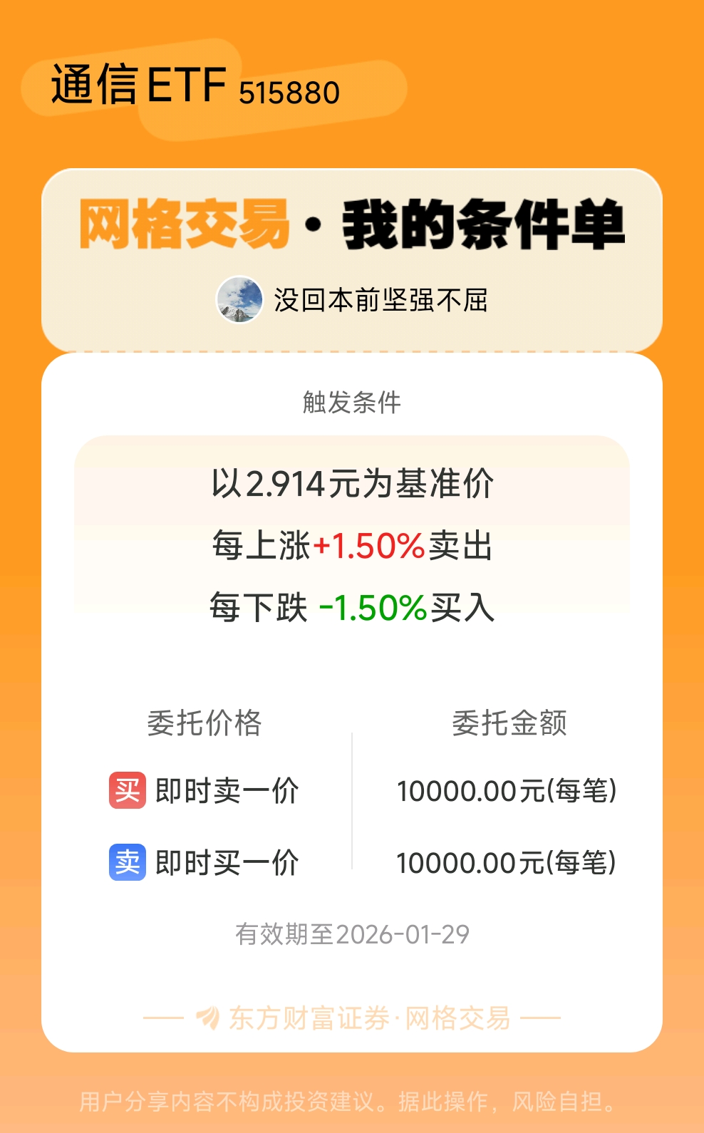 #条件单交流# #网格交易晒单# 一位股神设置了一个网格交易条件单,接下来就是见证奇迹的时刻~$通信ETF(SH515880)$
