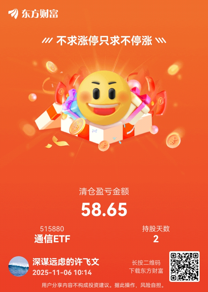$通信ETF(SH515880)$ 小赚也要走。股票就是玩游戏。图个快乐而已。